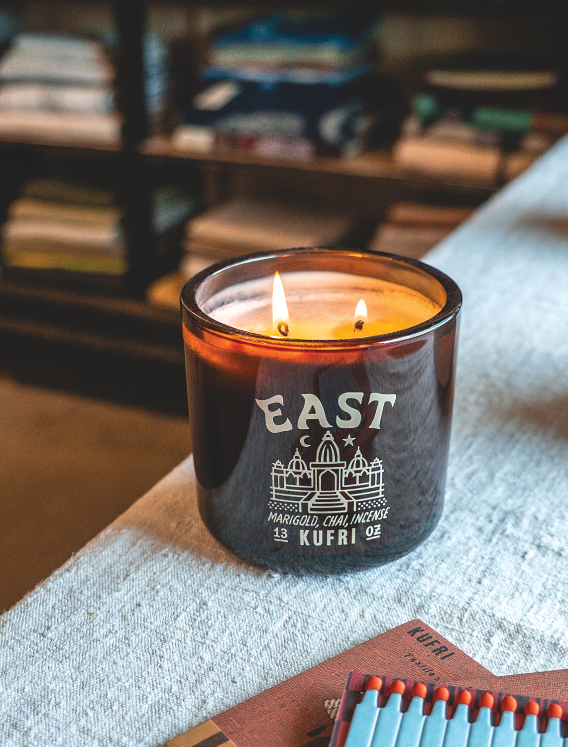 Let our East candle transport you to the temples of India. Golden marigolds strewn across the threshold, the intoxicating scent of incense wafting from its interiors, warm spiced chai being poured for devotees.