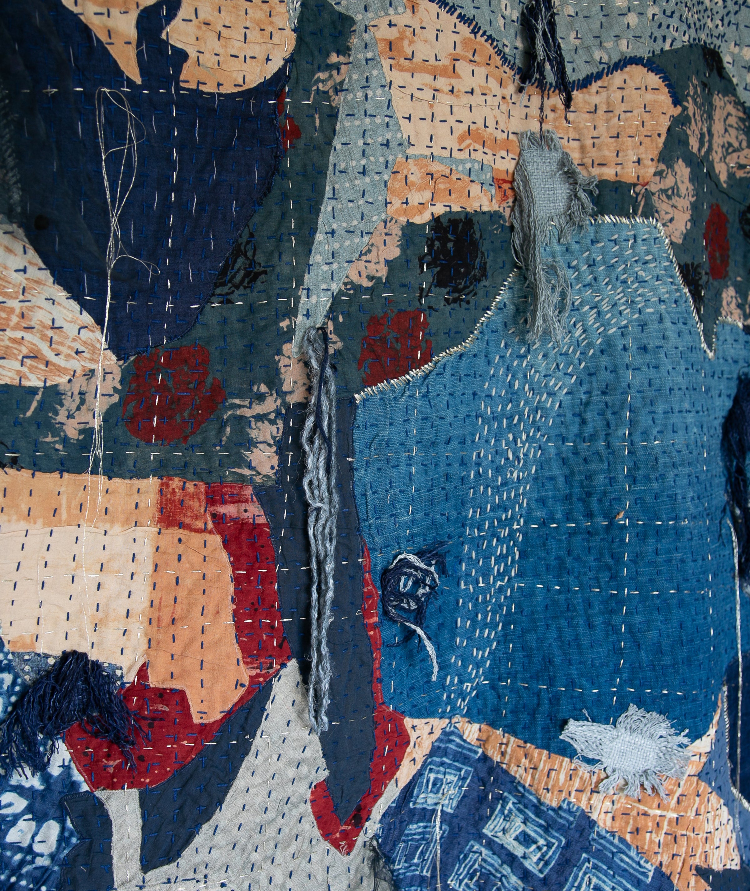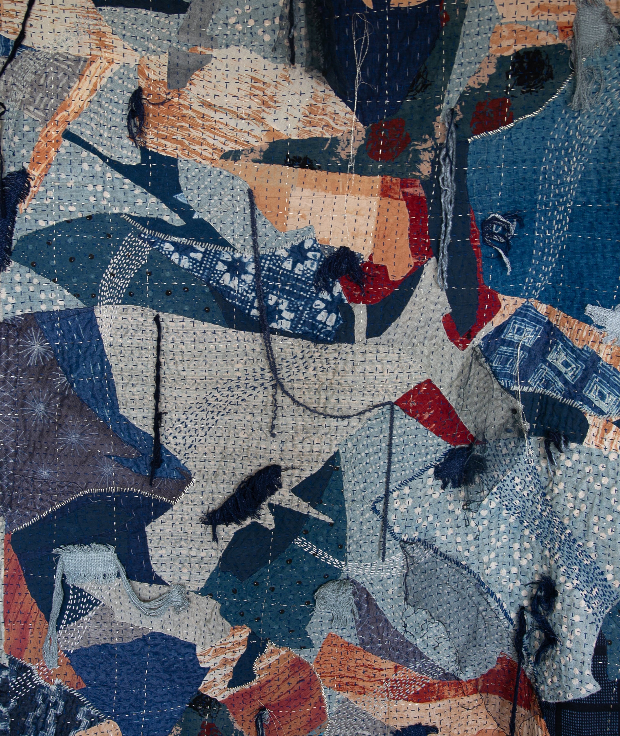 Formerly displayed at the Indigo Threads exhibition, 2024-2025, at The Crow Museum of Asian Art in Dallas, 'Ruminations' is an 7'x8' piecework textile-- a wild exploration of authentic indigo textiles from Japan, India and West Africa, creating a contemporary, cross-cultural statement of migration of the revered dye. Countless meticulous stitches and wave-like patterns mimic the movement of water in an indigo vat.